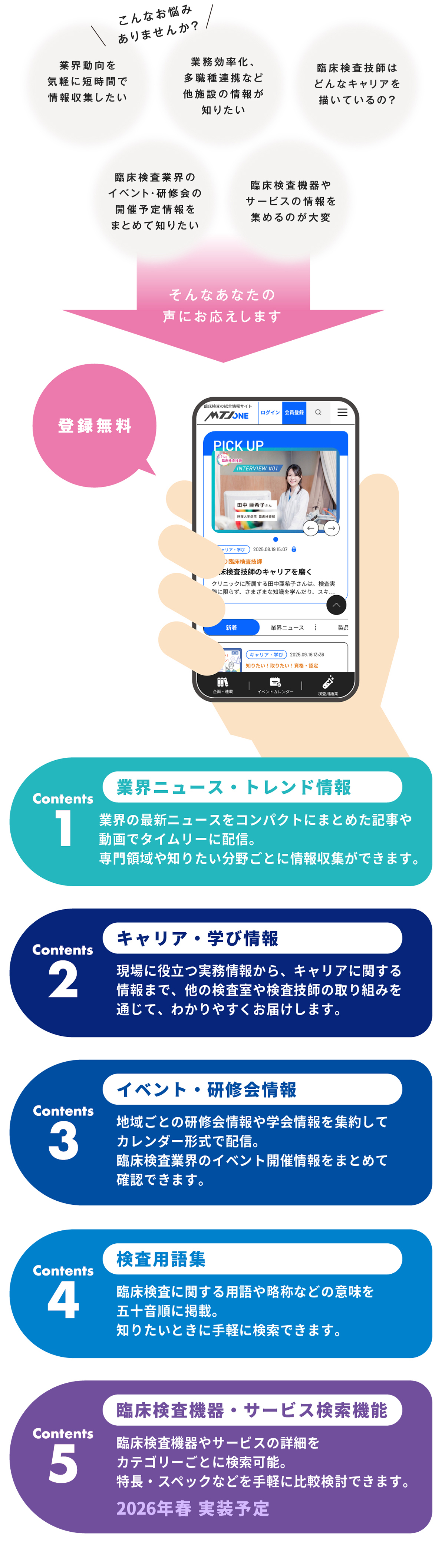業界のトレンド情報や、キャリア・学び、各検査室の取り組みなど、一人ひとりのスキルアップ、キャリア、ノウハウの蓄積に役立つ正確で有益な情報をぜひご活用ください。
